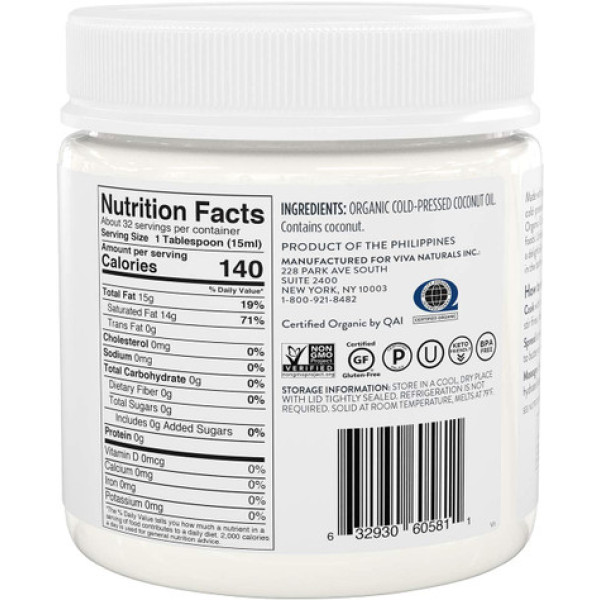 З оливковою олією або іншими розплавленими маслами Viva Naturals Organic Coconut Oil буде прекрасно підходити для панчох до хліба або мастило для чудової альтернативи вершковому маслу, перша поживна речовина підходить для будь-якого очищення . Також, вона є ідеальним додатком до Вашої рутини краси. Завдяки своїм харчовим властивостям, органічна олія кокоса чудово підходить як природне масло для волосся і зволожувач для шкіри. Його склад проникає й зволожує, роблячи Вашу шкіру м'якою і шовковистою, без неприємних відчуттів. Чи використовуєте Ви олію кокоса для волосся або в якості органічного засобу для тіла, Ви полюбите результати цієї супер-зволожуючої олії. Ви навіть можете використовувати олію кокоса для виготовлення блиску для губ. * 100% олія кокоса, приготована зі свіжих органічних кокосів * сертифікати кето і палео * сертифікат USDA-органічної якості * масло для приготування, дружливе з кето і палео * природний зволожувач для тіла й волосся