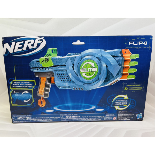 Бластер Nerf Elite 2.0 Flipshots Flip-8 має 8 стволів, 4 спереду та 4 ззаду. Запустіть пульки з передніх стволів, а потім переверніть задні стволи вперед, щоб продовжувати вибух.