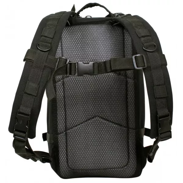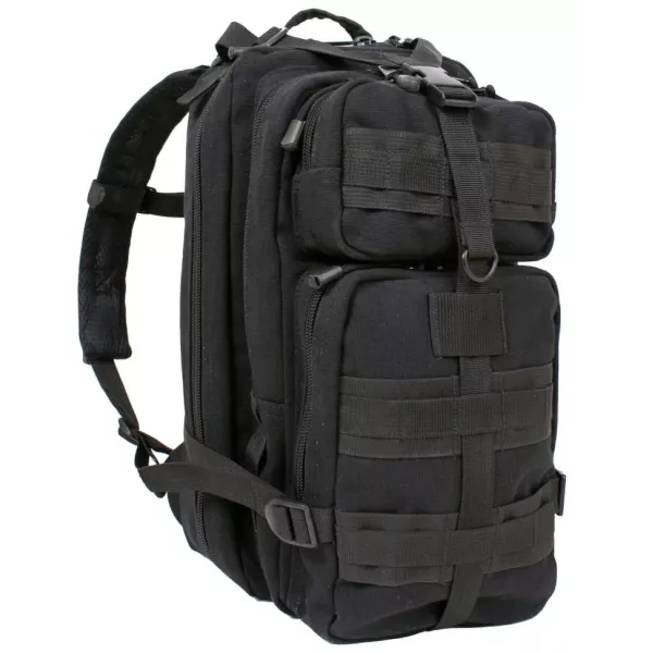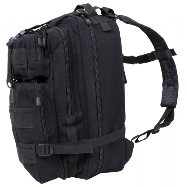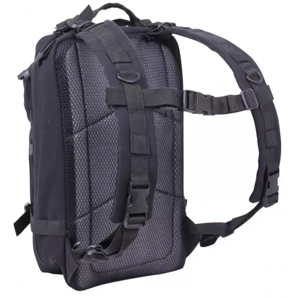 Тактичний хлібний рюкзак. Модель є копією рюкзака Falcon-II виробництва компанії Maxpedition. Великий головний відсік (розмір 45 х 25 х 12 см) на блискавці (з кишенею на блискавці та сітчастою кишенею всередині). Другий відсік (розмір 38 х 20 х 5 см) на блискавці (з сітчастою кишенею всередині). 2 зовнішні кишені на блискавках (розмір верхньої кишені 10 х 18 х 6 см, розмір нижньої кишені 25 х 20 х 6 см). Кишеня для пухиря питтєвої системи на спинці з застібкою на липучці велкро. Підповілення спинки з вентиляційною сіткою. Підповілені плечові лямки з вентиляційною сіткою. Пряжки фастекс на регульованих ремінцях плечових лямок. Металеві D-кільця на плечових лямках рюкзака. Регульований поясний ремінь з пряжкою фастекс. Бічні регульовані ремені на пряжках. Y-подібний регульований ремінь на пряжці фастекс з металевим D-кільцем на зовнішній стороні рюкзака. Грудяний ремінь з пряжкою фастекс для фіксації плечових лямок. Ручка для носіння в верхній частині рюкзака. Стрічки (100% поліестер) для кріплення підсумків MOLLE і ALICE по боках рюкзака. Стрічки (100% поліестер) для кріплення підсумків MOLLE і ALICE на зовнішній стороні рюкзака (з велкро - в верхній частині). Матеріал: передварительно вимитий, важкий 100% бавовна густого переплету (брезент). Колір: чорний. UPC: 613902450592. Виробник: ROTHCO (NY, USA). Виготовлено в Індії для США.