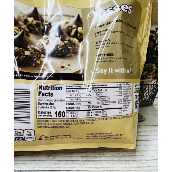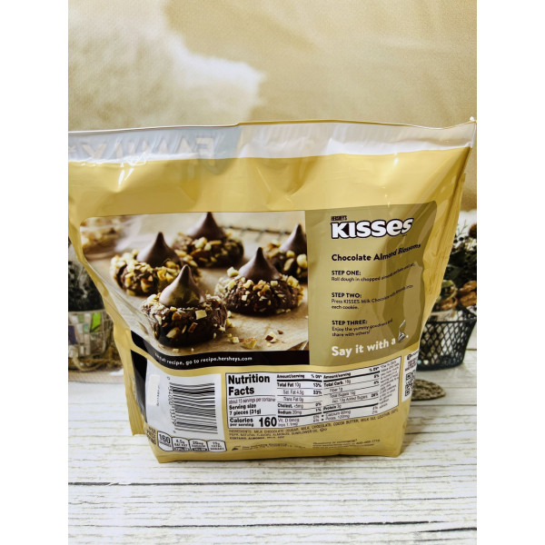 Шоколадні цукерки Hershey's Kisses – ніжні цукерки. У такій упаковці цукерки особливої форми Kisses, кожна обгорнута у фольгу з хвостиком зверху. Компактний розмір Kisses означає, що ви можете легко взяти кілька цукерок у гаманець або сумку під час подорожі далеко від дому.
