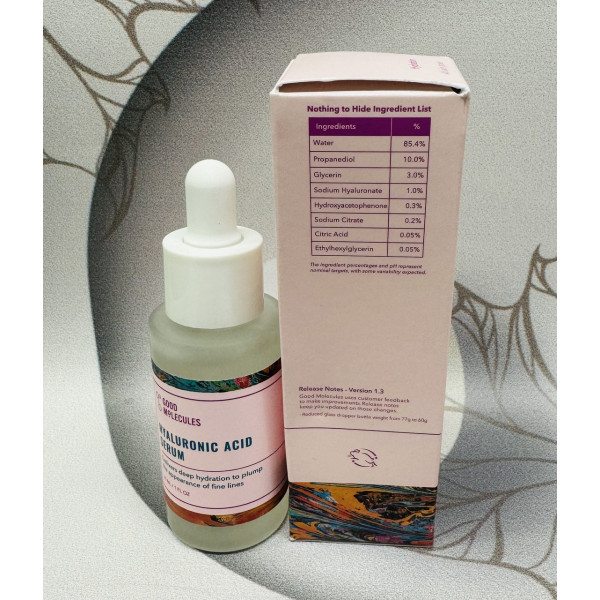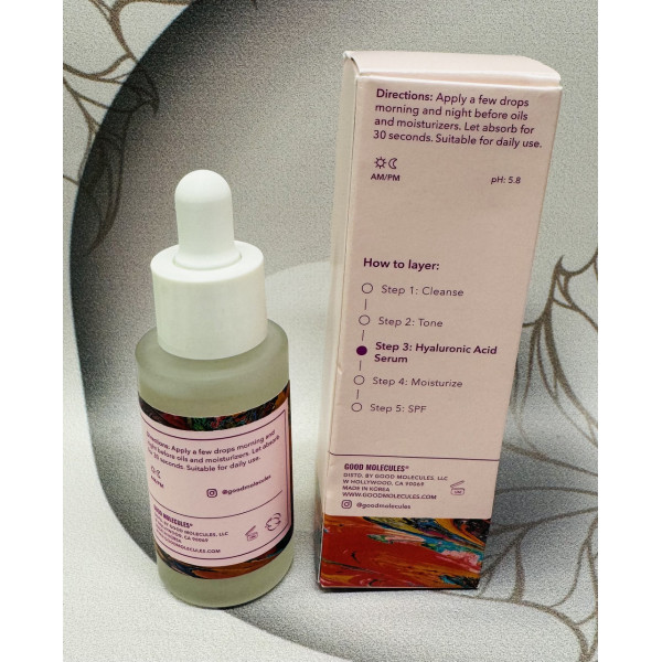 Good Molecules - Сироватка з гіалуроновою кислотою - глибоко зволожуюча сироватка з гіалуронатом натрію - активної та ефективної похідної гіалуронової кислоти. Цей компонент зв'язує воду в епідермісі, завдяки чому підтримує оптимальний рівень гідратації, а також додатково розгладжує та тонізує шкіру. Легка формула на водній основі легко наноситься на шкіру та під макіяж, сироватка підходить для щоденного догляду. Продукт має pH 5,8, а його веганська формула і без запаху.