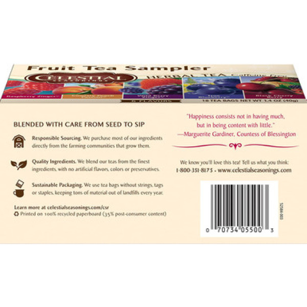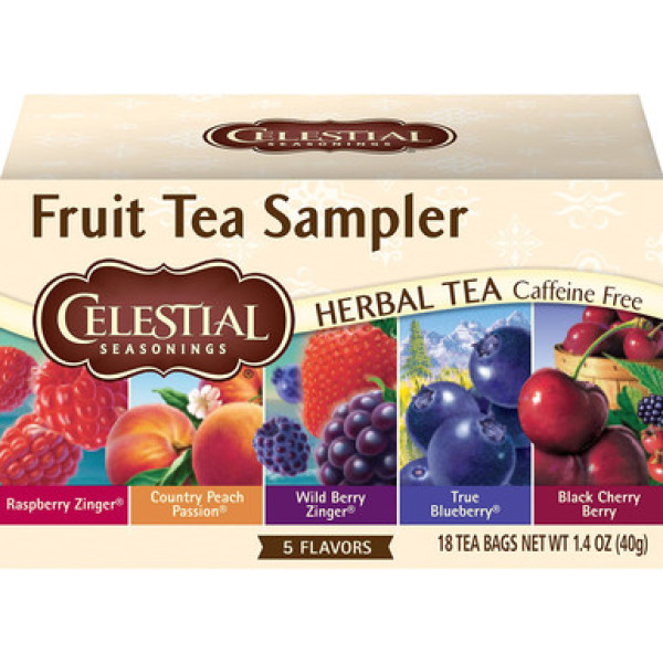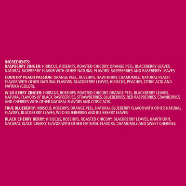 Малиновий Зінгер, Країнська Персикова Страсть, Дикий Ягідний Зінгер, Справжній Голубийбері, Чорная Вишневая Ягода. Природно безкофеїнові. Наш сет фруктових чаїв включає смачні перемішування улюблених смаків фруктів і ягід. Як вишуканий спосіб спробувати всіри красу природних фруктових напоїв! Даруйте собі ягідну веселку із пристрасним смаком у Чорної Вишневої Ягоди. Святкуйте смак літа у будь-яку пору року! Ці продукти містять природні трави і смаки, не містять штучних фарб або консервантів. Без глютену. Упаковка може відрізнятися.