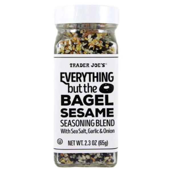 Trader Joe's Everything but the Bagel Сезамова суміш для пряностей - єдині пряності, які вам знадобляться для прикраси і додавання вишуканого смаку вершкового сирку, макаронів з сиром, попкорну з маслом, печінок, маринадів для салатів, тіста піци, соусів для салату, пасти, Мак&чіз, або будь-чого іншого.