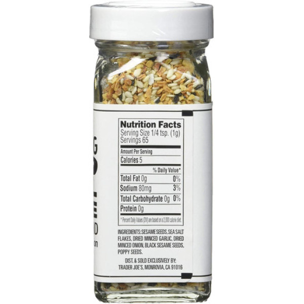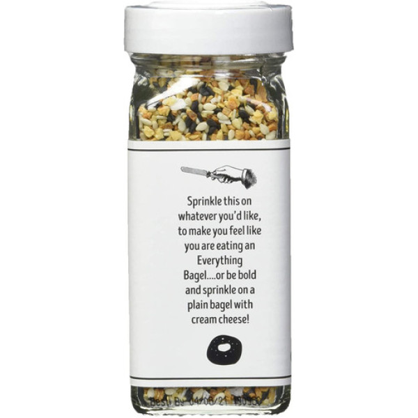 Trader Joe's Everything but the Bagel Сезамова суміш для пряностей непомітно підкреслить смак вашого домашнього бейгла. Завдяки вишуканому поєднанню смажених насіння сезаму, насіння маку, сушеного часнику і цибулі та хрустких сільних пластівців, ви надовго запам'ятаєте приємні смаки цього солоного снеку. Ви зможете використовувати цю суміш на піци, попкорні, випічці, салатах і набагато більше, оскільки вона надихне ваші смакові рецептори.