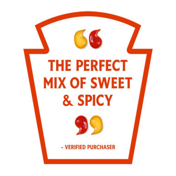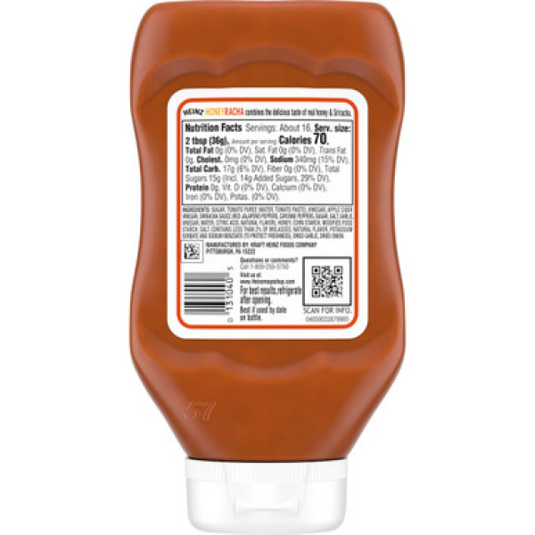 Смакуйте сезон із Heinz Honeyracha Honey & Sriracha Sauce! Цей соус поєднує в собі солодкий мед і гострий смак соусу срірача - по-справжньому унікальна комбінація для вашої кухні. Він такий універсальний, що стане ідеальним доповненням до будь-якого шашлику під час вечірки 4 липня. Чудово підходить для замачування вагітних пагонів хрусткої курочки, підживлення якісних картопляних смажених дольок і додавання трохи пікантності до сендвічів з смаженим курячим філе. Пропонується в легкій і зручній судочці з можливістю повторного застібання. Зберігайте в холодильнику після відкриття. Heinz Honeyracha Honey & Sriracha Sauce - солодко-гострий затишок для всіх вікових категорій! Вага: 20.2 унції. Склад: Цукор, томатна пюре (вода, томатна паста), оцет, яблучний оцет, соус срірача (червоні перці халапеньо, перець кайєн, цукор, сіль, часник, оцет, вода, лимонна кислота, натуральний аромат), мед, кукурудзяний крохмаль, змодифікований крохмаль, сіль, меласа, натуральний аромат, сорбат калію і бензоат натрію (для збереження свіжості), сушений часник, сушена цибуля.