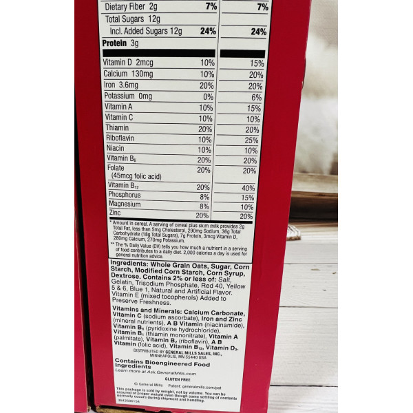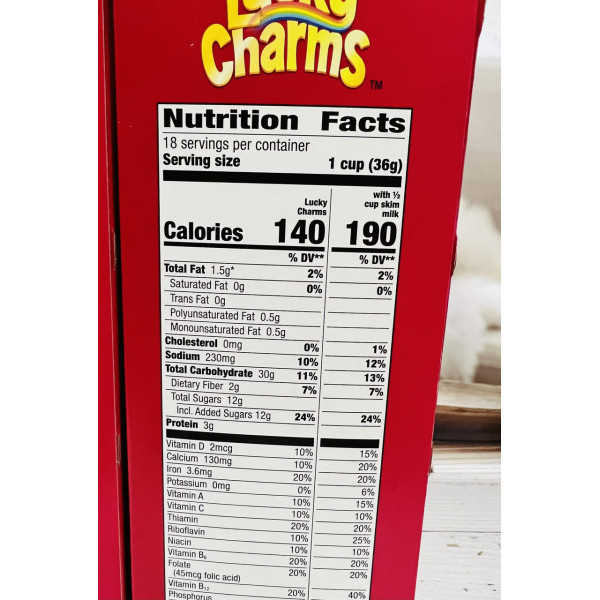 Традиційні пластівці Lucky Charms містять: цільний овес; вівсяне борошно; зефір маршмеллоу; фруктозу; кукурудзяний сироп; вітаміни та мінерали.