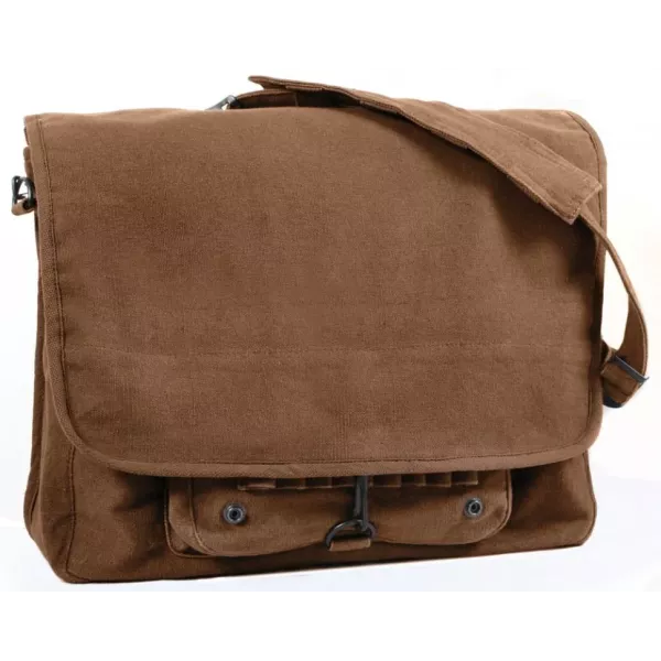 Студентська вінтажна сумка. Велика камера для підручників або ноутбука. 3 невеликі відділення. Ремінь на плече регулюється від 76 см до 139 см. Металеві карабіни і кільця. Закривається клапаном на карабіні. Розмір: 38 X 28 X 10 см. Матеріал: зношений, щільний, 100% бавовна. Колір: коричневий. Виробник: Rothco, США. Зроблено в Індії.