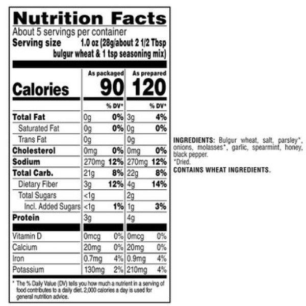 Near East Tabouleh предоставляє бульгур, а також суміш м'яти, петрушки та часнику; просто додайте свіжий помідор, лимонний сік та оливкова олія, щоб створити цей прохолодний та освіжаючий салат. Подавайте його як смачну альтернативу традиційним гарнірам на вашому наступному пікніку або барбекю, або як легкий обід в будь-який час. Near East Tabouleh має сертифікат Кошер.