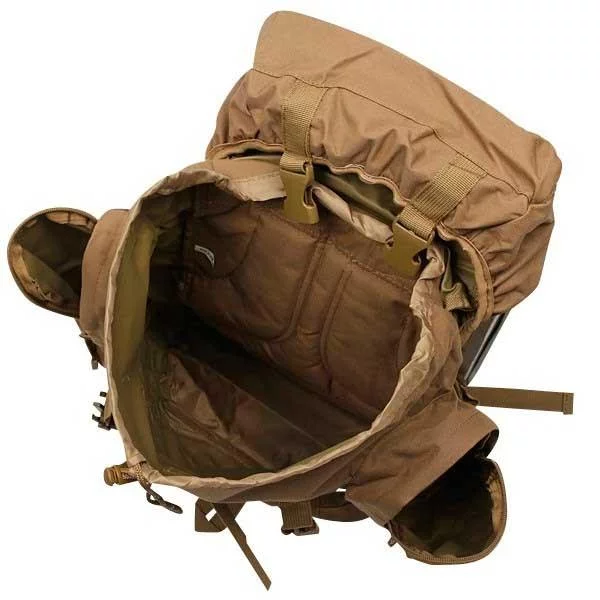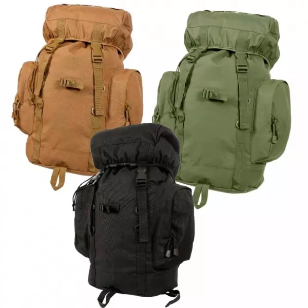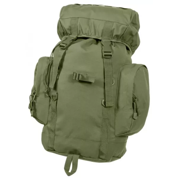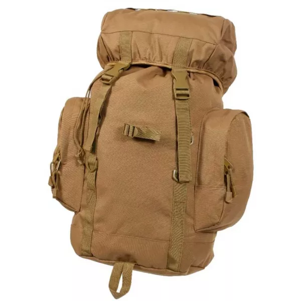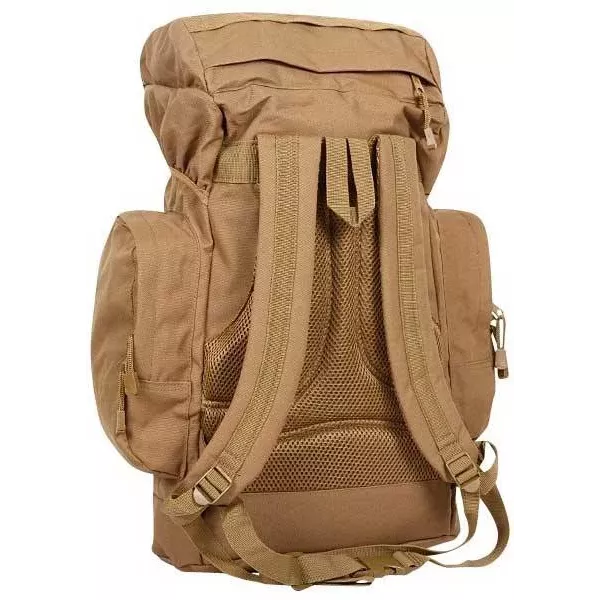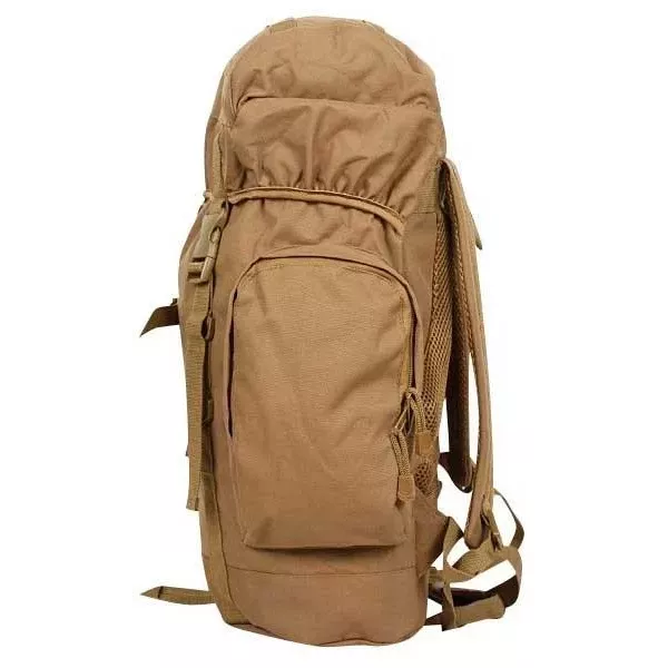 Легкий, повністю водонепроникний, рюкзак для туристичного або тактичного використання. Велике головне відділення з затягуванням, що закривається зверху клапаном-карманом на застібках фастекс. Верхній клапан має вбудований прихований карман на блискавці і по зовнішньому краю вшиту еластичну гумку для щільного прилягання до основної частини рюкзака. Два зовнішніх бічних об'ємних кармани на блискавці. Підповерхнева спинка з вентиляційною сіткою. Підповерхневі плечові ремені. Застібки фастекс на регулюючих ременях плечових ременів. Ручка для перенесення в верхній частині ранця. Полімерні D-кільця на зовнішній стороні рюкзака для кріплення додаткового обладнання. Стрічка з затягуванням на зовнішній стороні ранця для кріплення лопати або ліхтарика. Нижня петля для фіксації черенка лопати. Регульований поясний ремінь з пряжкою фастекс. Матеріал стрічки: 100% поліпропілен. Матеріал: водонепроникний, 600 Деньй поліестер з ПВХ. Матеріал блискавки: нейлон з водонепроникним пропиткою. Матеріал пряжок: ABS-полімер. Розмір: 50 х 28 х 15 см. Об'єм повної завантаження: 25 літрів. Кольори: оливковий, чорний, койот. Виробник: ROTHCO (НЙ, США). Виготовлено в Китаї.