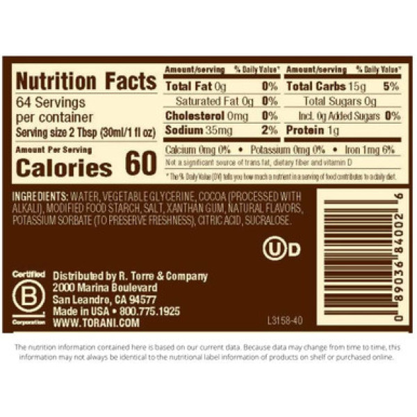Torani Sugar Free Dark Chocolate Sauce, 64 Ounce - це чудовий продукт, який допоможе вам насолодитися шоколадним смаком без зайвих калорій. Виготовлений з темного шоколаду, цей соус має складний, гіркий смак, який підкреслений солодкістю сукралози. Ви можете додати цей чудовий смак шоколаду до напоїв та десертів, не додаючи жодного цукру.