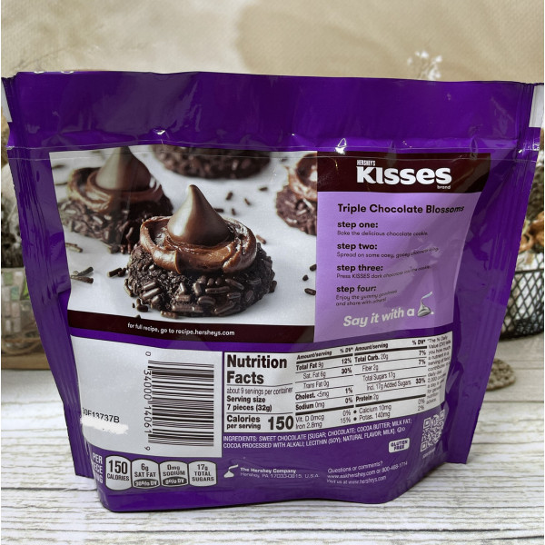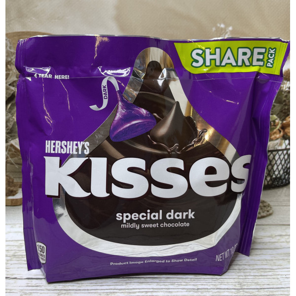 Шоколадні цукерки Hershey's Kisses – ніжні цукерки. У такій упаковці цукерки особливої форми Kisses, кожна обгорнута у фольгу з хвостиком зверху. Компактний розмір Kisses означає, що ви можете легко взяти кілька цукерок у гаманець або сумку під час подорожі далеко від дому.