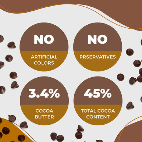 45% ВМІСТ КАКАО - Багатий вміст какао надає цим шоколадним крихтам автентичний смак, а 3,5% какаового масла робить їх кремовими та більш корисними. Використовуйте їх, щоб збагатити ваші солодкі моменти.