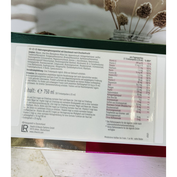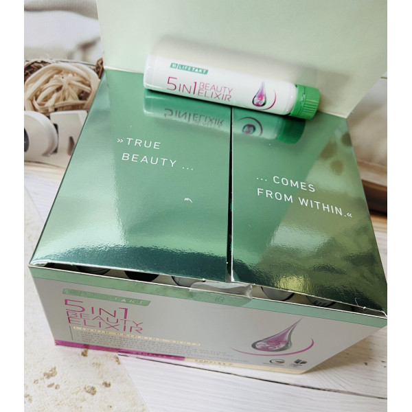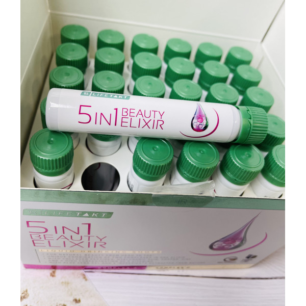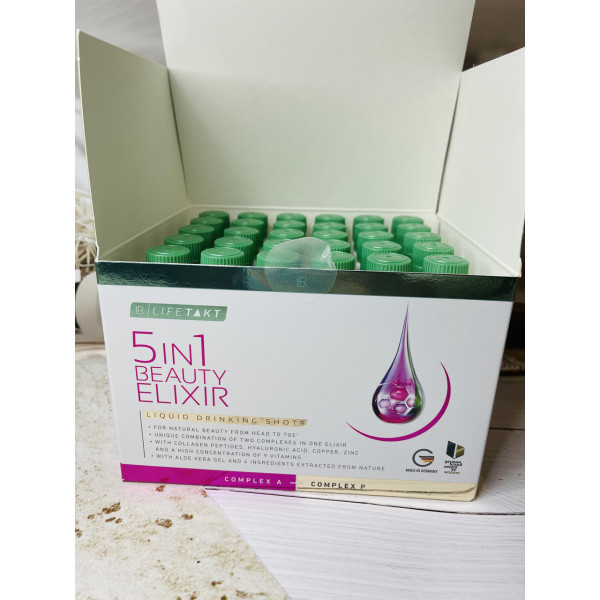 Набір LR Lifetakt Beauty Elixir 5 in 1 (Еліксир краси 5 в 1) від німецького виробника Health Beauty, це спеціальний комплекс, який призначений для виконання п'яти бажань: повернення молодого виду, бездоганного відтінку шкірних покривів особи, міцного тіла, зміцнення волосся і нігтів. Кожна доза, в яку входять біоактивні компоненти (гіалуронова кислота, пептид колагену, мідь, цинк, вітамінний комплекс, гель Алое Віра, рослинні екстракти), націлена на зменшення виразності зморшок, поліпшення якості дерми, зниження целюліту, відновлення структури волосся, прискорення росту нігтів і їх зміцнення. Використовуючи цей унікальний препарат кожен день, ви завжди будете молодою і красивою.