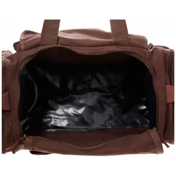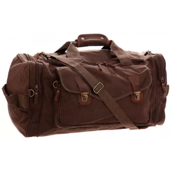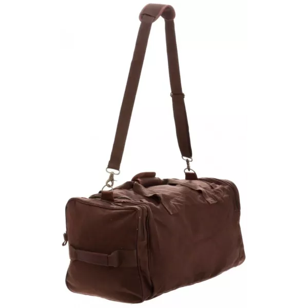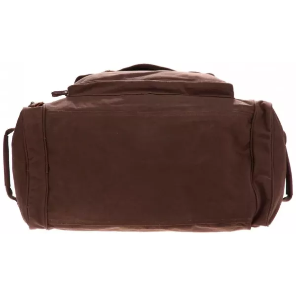 Вінтажна дорожня сумка з густою бавовняною тканиною, шкіряними ремінцями та мідними замками. Застібається на пластикові блискавки. Три зовнішні великі кишені на блискавці. Знімний, регульований плечовий ремінь на карабінах. Розміри: 58 X 30 X 28 см. Матеріал: густа 100% бавовна. Матеріал ручок: бавовна густої вʼязки. Матеріал вставок: шкіра. Колір: коричневий. Виробник: Rothco, USA. Виготовлено в Індії.