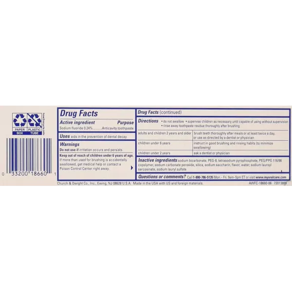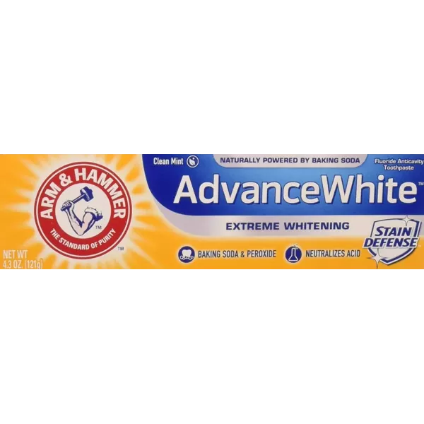 Американська зубна паста Arm & Hammer Advance White Extreme Whitening (121 г) має відбілювальний ефект завдяки вмісту патоки та пероксиду водню. Вона забезпечує здоров'я зубів та ясен шляхом глибокого очищення, нейтралізуючи шкідливі кислоти, які впливають на емаль та призводять до її вивітрювання. Зубна паста проникає між зубами та вздовж лінії ясен для тщательного очищення. Вона видаляє більше нальоту в складних місцях, ніж звичайна зубна паста. Завдяки м'якій силі патоки, формула не пошкоджує емаль зубів, а забезпечує безпечне відбілювання. Це ідеальна формула для глибокого очищення, яка підтримує здоров'я ясен, очищаючи між зубами та вздовж лінії ясен. Зубна паста Arm & Hammer випробувана формула з використанням патоки та пероксиду водню. Формула з пероксидом водню забезпечує свіжість подиху, убиваючи мікробів в роті. Вона видаляє та запобігає утворенню нових плям за допомогою технології Stain Defense ™. Формула також запобігає утворенню зубного каменю (Tartar Control). Зубна паста має чистий м'ятний смак. Активні інгредієнти: фторид натрію 0,24%. Неактивні інгредієнти: патока, PEG-8, PEG/PPG-116/66 кополімер, пероксид карбонату натрію, тетранатрієва пірофосфат, кремнезем, сахарин натрію, ароматизатор, вода, лаурилсульфат натрію, лауроїлсаркозинат натрію. Примітка: склад продукту може змінюватися в рамках поліпшення формули. Будь ласка, ознайомтесь зі складом, вказаним на упаковці. Рекомендовано використовувати зубну пасту для дорослих і дітей віком старше 6 років. Рекомендується чистити зуби після кожного прийому їжі, але не рідше двох разів на день. Смак: м'ята. Вага: 170 г. Вироблено в США компанією Church & Dwight Co., Inc (Edwing, NJ). Вироблено в США.