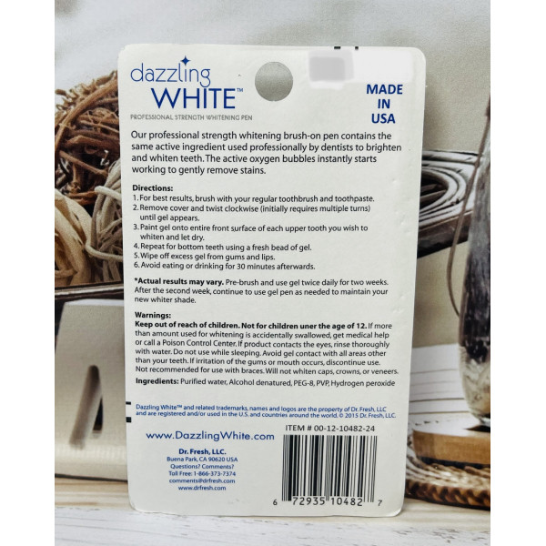 Якщо ви хочете швидко й безболісно, а головне нешкідливо відбілити зуби, то Dazzling White для вас! Легкодоступний дизайн і ультрам'який пензель-аплікатор робить застосування вибілювальної ручки неймовірно простим. Вона може бути використана понад 50 разів. Інструкція із застосування: Нанести вазелін безпосередньо на губи та ясна перед початком застосування, щоб запобігти подразненню. Струсуйте ручку впродовж 5 секунд, потім зніміть захист із кінця щітки та повертайте за годинниковою стрілкою доти, поки гель покриє щітку. Акуратно нанесіть тонкий шар гелю на зуби, уникаючи потрапляння на ясна та губи. За потреби провертайте олівець за годинниковою стрілкою для вилучення гелю. Переконайтеся, що покрили всю поверхню зубів. Зачекайте 20 секунд, поки вибілювальна речовина не висохне на зубах, до зіткнення з язиком або губами та залиште гель на зубах на 10 хвилин, потім прополощіть рот водою. Не рекомендується їсти та пити упродовж 30 хв після процедури. Повторіть процедуру за потребою, але не частіше ніж двічі на день. Ви можете чистити зуби, використовуючи зубну пасту до або після використання Dazzling White, однак, переважно після. Використовуйте продукт тільки за призначенням (тільки для справжніх зубів). Він не призначений для дітей до 14 років, оскільки продукт містить перекис. Надмірне використання може тимчасово призвести до чутливості зубів. Не використовуйте, якщо є алергія на будь-які компоненти, якщо з'являється подразнення або набряк, або з'являється чутливих зубів. Зверніться до стоматолога або лікаря, якщо проявиться будь-який із цих симптомів. Тільки для зовнішнього застосування. Може фарбувати або знебарвлювати тканини. Якщо ваші зуби стали чутливішими після використання Dazzling White, у такому разі рекомендується їх чистити після закінчення 2 годин після процедури.