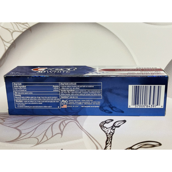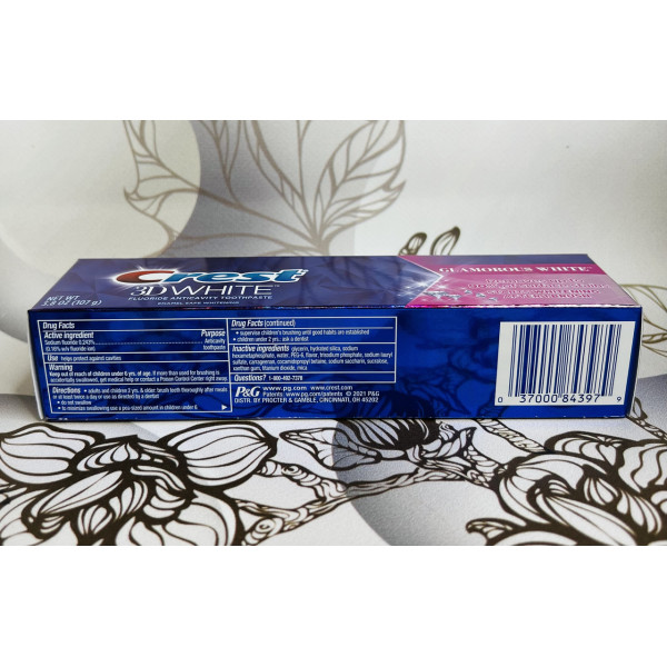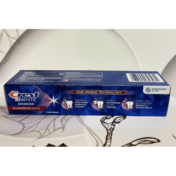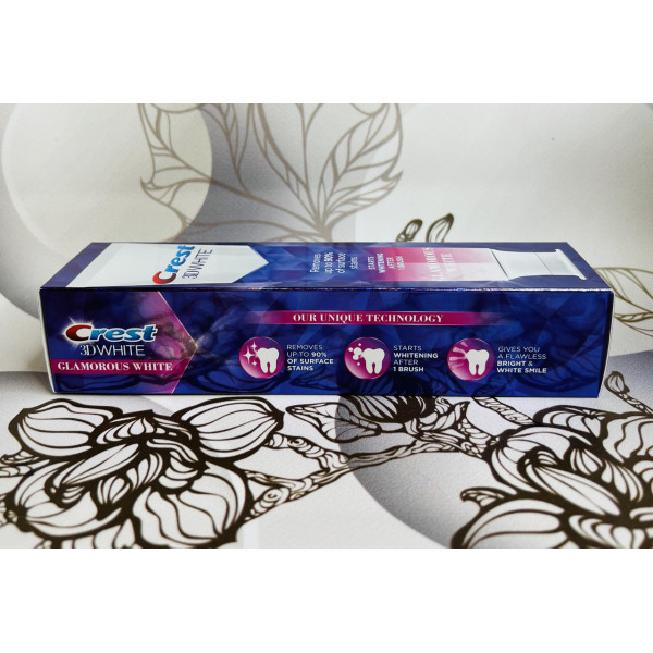 Зубна паста Crest 3D White Glamorous White створена за спеціальною гібридною технологією та поєднує в собі два компоненти: очищувальна паста та вибілювальний і освіжний подих гель. Цю вибілювальну пасту добре застосовувати як самостійний засіб вибілювання і як ідеальний засіб підтримки ефекту первісної білини, після використання вибілювальних смужок Crest . Формула цієї пасти переносить її на якісно новий рівень вибілювання зубів у домашніх умовах, тому що мікроочисники, що входять до складу зубної пасти, не тільки поступово видаляють потемніння на зубній емалі, а також виступають у ролі щита, перешкоджаючи утворенню нових потемнінь.