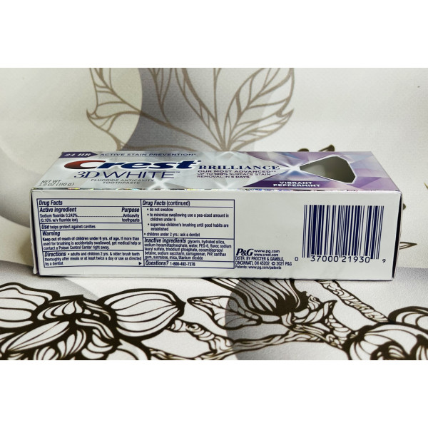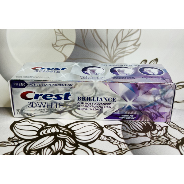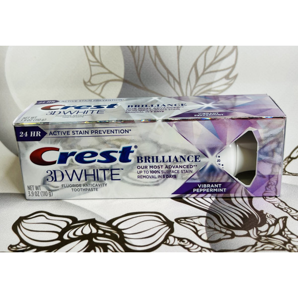 У зубну пасту Crest 3D white Brilliance входить новий комплекс (Illuminating), роблячи вашу посмішку сліпучо-білою і сяючою. Ця паста захищає від появи зубного нальоту, дає блиск і сяйво вашим зубам вже після першого застосування.