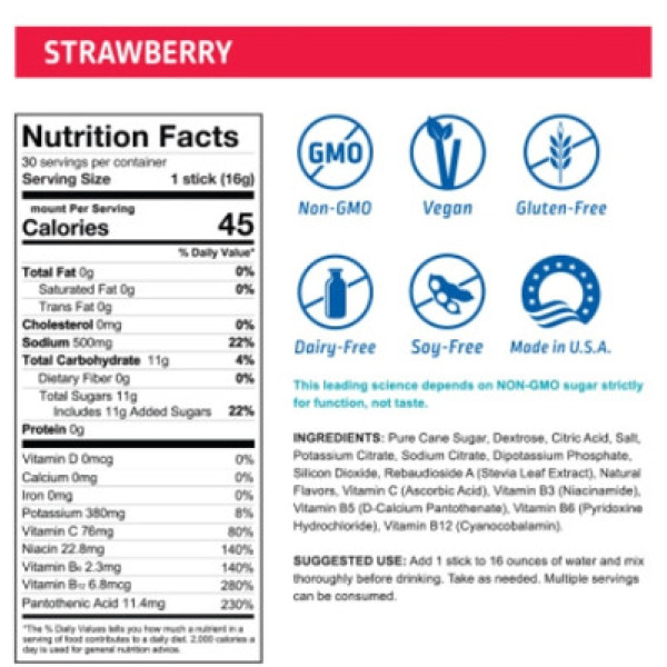Состав: Сахар тростниковый, декстроза, лимонная кислота, соль, цитрат калия, цитрат натрия, фосфат дикалия, диоксид кремния, ребаувозид А (экстракт листьев стевии), натуральные ароматизаторы, витамин C (аскорбиновая кислота), витамин B3 (ниацинамид), витамин B5 (д-кальций пантотенат), витамин B6 (пиридоксин гидрохлорид), витамин B12 (цианокобаламин).