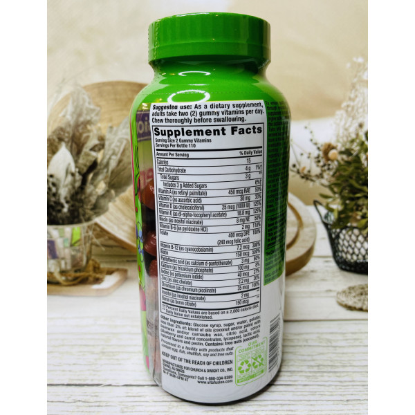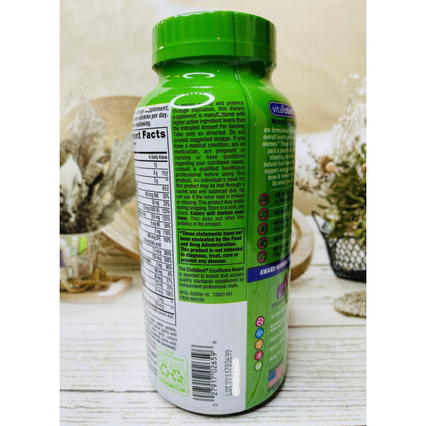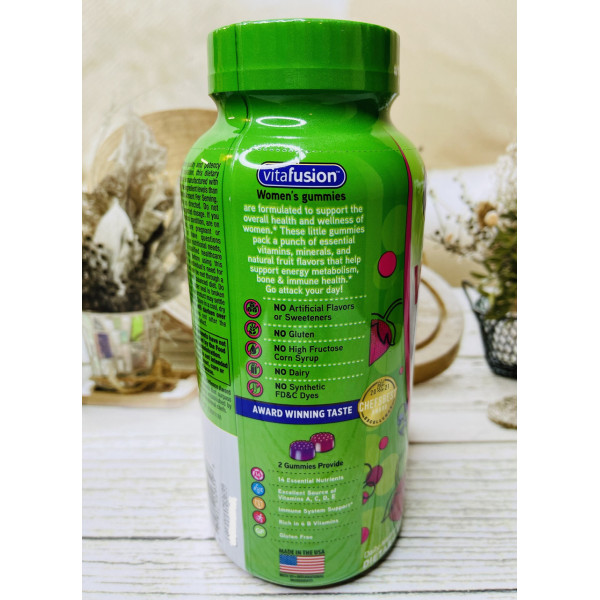 Комплекс Vitafusion Women's Adult Vitamins Energy Metabolism & Bone Support містить усі необхідні мікроелементи, які необхідні для здорового метаболізму. Покращує шкіру, надає здорову енергію, зміцнює нігті, волосся, зменшує кількість застуд та головного болю.