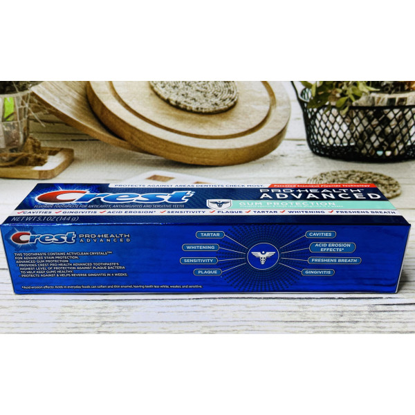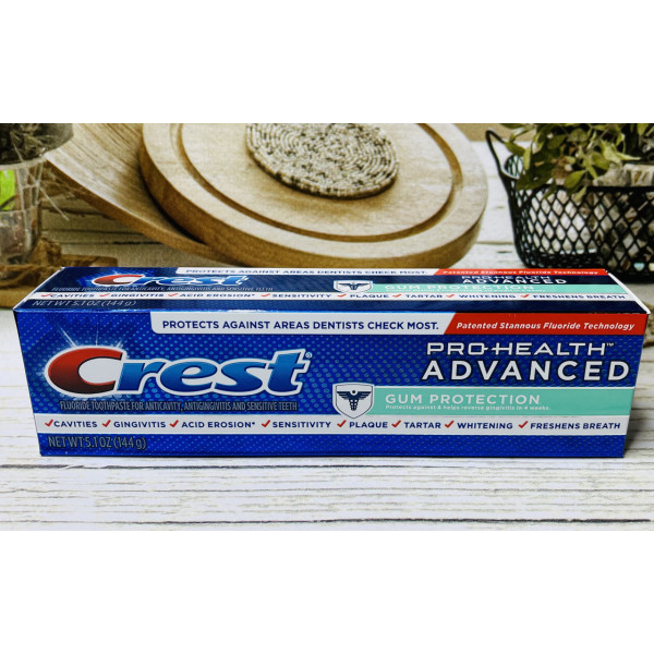 Зубна паста Crest Pro-Health Advanced Extra Gum Protection Toothpaste бореться з карієсом, гінгівітом, кислотною ерозією*, чутливістю зубів, нальотом і зубним каменем. Допомагає вибілити зуби та робить дихання свіжим. Порівнюючи зі звичайною фторовмісною зубною пастою Crest Pro-Health Advanced Extra Gum Protection Toothpaste за регулярного використання, забезпечує постійний захист від нальоту та гінгівіту.