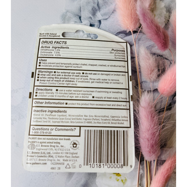 Inactive Ingredients: Mineral Oil (Paraffinum Liquidum), Microcrystalline Wax (Cera Microcristallina), Coppernicia Cerifera (Carnauba) Wax, Theobroma Cacao (Cocoa) Seed Butter, Fragrance (Parfum), Tocopheryl Acetate, Flavor, Isopropyl Myristate, Saccharin, Beta Carotene (CI 40800), Zea Mays (Corn) Oil